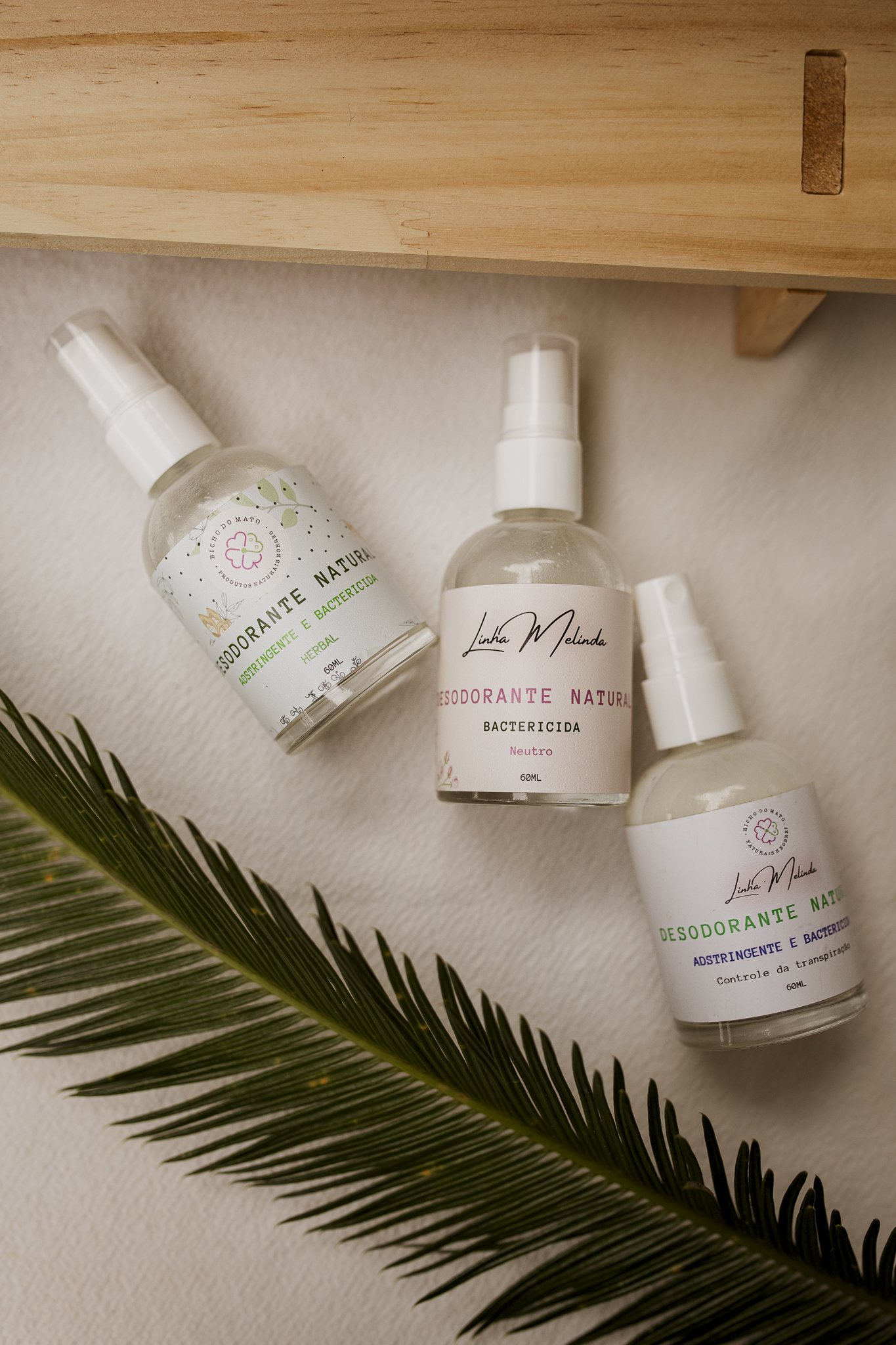 Desodorante 100% natural em spray, função bacterida e com ingredientes que auxiliam no controle e equibrio da transpiração. *formulação livre de bicarbonato de sódio, esta versão conta com sinergia de óleos essenciais como ativo para potencializar esta formulação.