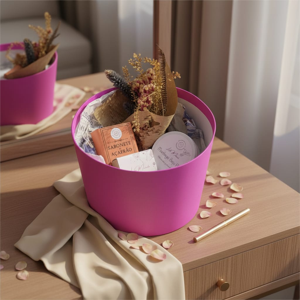 Caixa cartonada na cor rosa, contendo os itens: