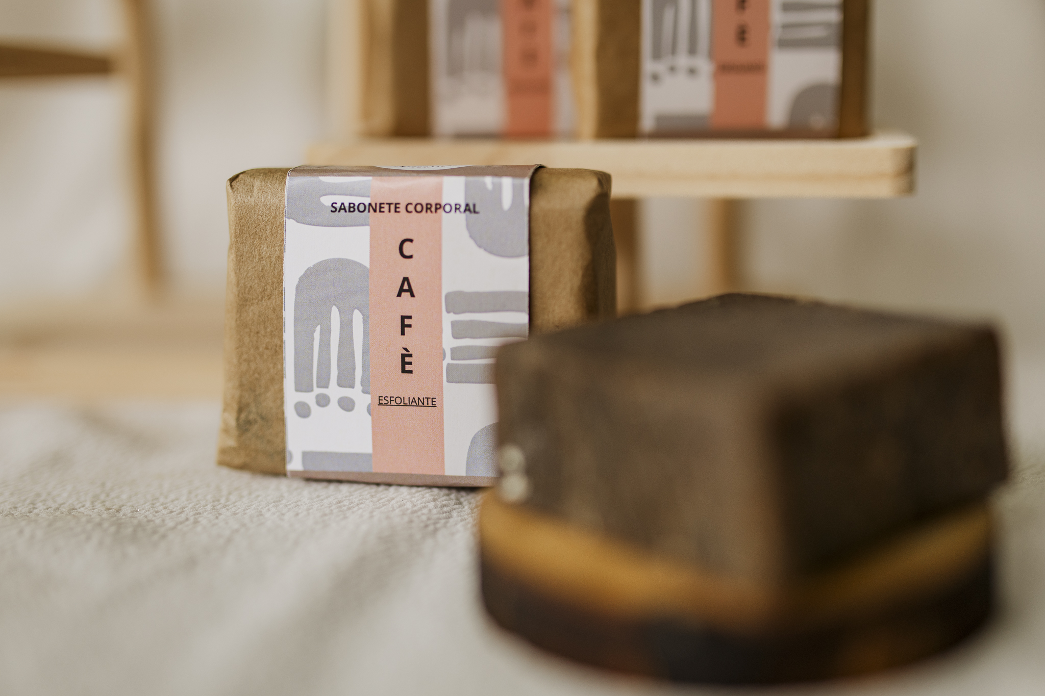 Sabonete corporal esfoliante com café. Este sabonete ao mesmo tempo que limpa também hidrata a pele, deixando macia e sedosa. Formulação 100% natural com óleo e manteigas vegetais.